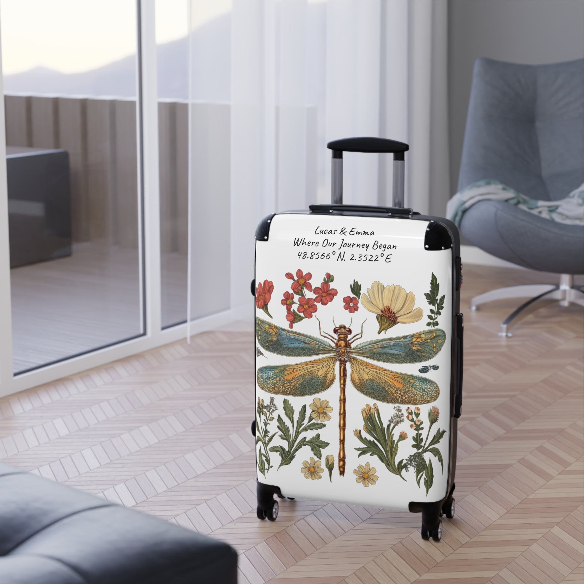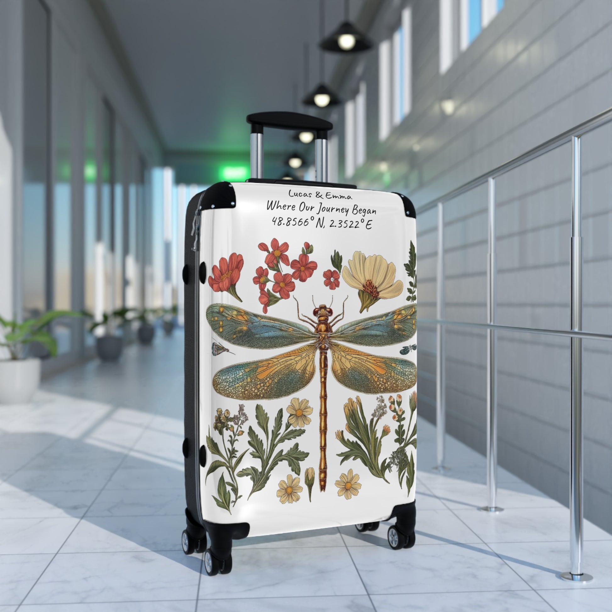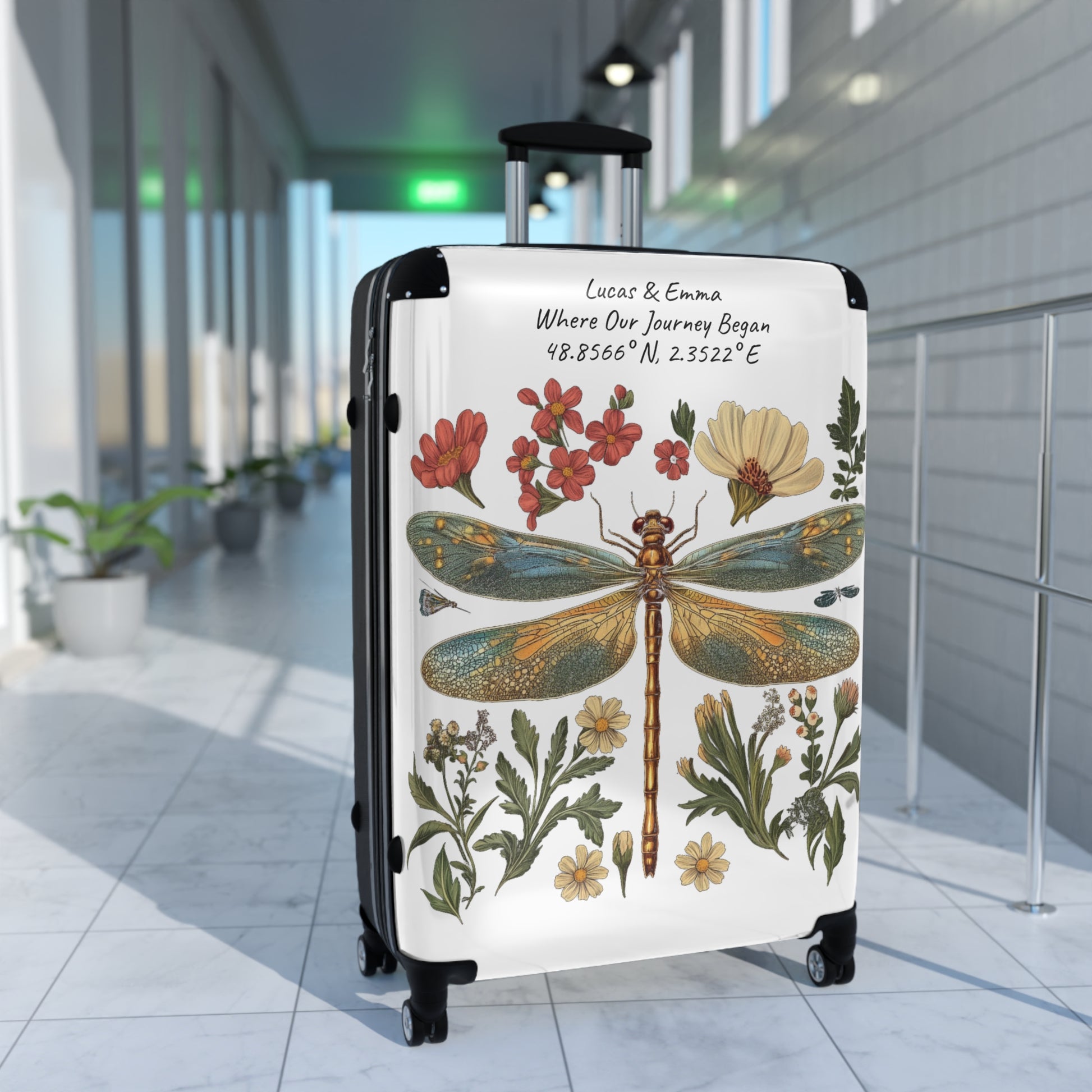 Personalised Dragonfly Suitcase Custom Botanical Luggage with Name Coordinates Travel Bag Gift for Couple Honeymoon Travel Suitcase